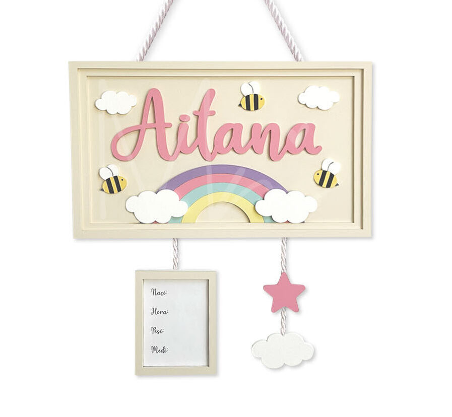 Letrero para bebé recién nacido que puedes usar en hospital o decoración de cuarto y donde puedes agregar sus datos de nacimiento. Con temática de arcoíris y abejas.